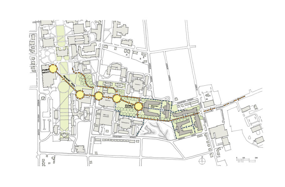 Planning included a new secondary campus entrance to the east of the housing development. This entrance welcomes pedestrian circulation from remote shuttled parking locations. Students enter through the east campus gateway, traverse through the residential and recreational areas en route to the academic part of campus on The Green.