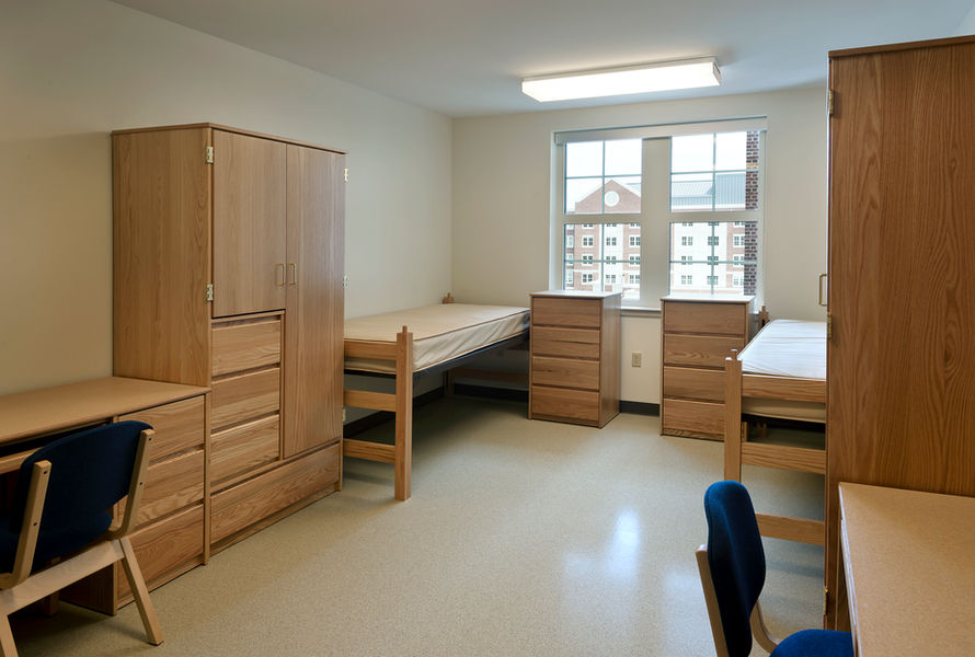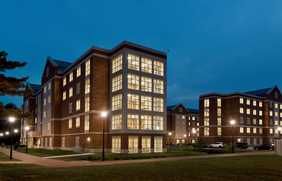On this part of campus, primarily populated by lower density residence halls, the 5-story concept and high density is unique and results in spectacular campus views from the upper floors of the two new buildings. This is augmented by the use of expansive floor to ceiling window walls at all common spaces throughout both buildings.